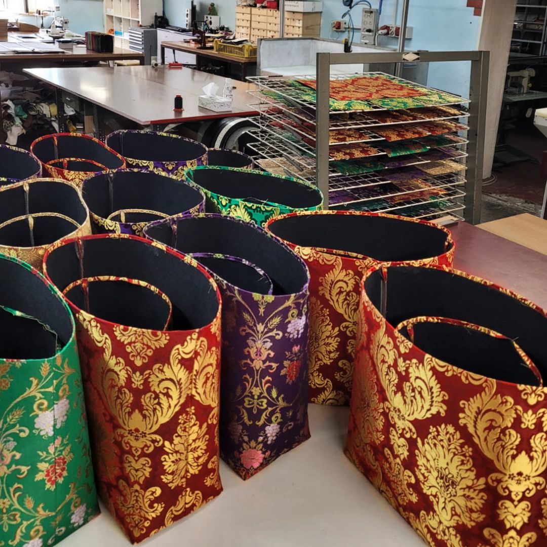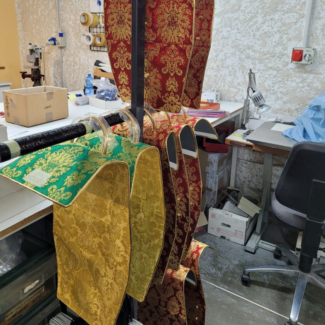 La produzione di broccati e lampassi PitG a filo oro avviene con macchine tessili a schede perforate della prima metà del ‘900, ormai quasi uniche al mondo