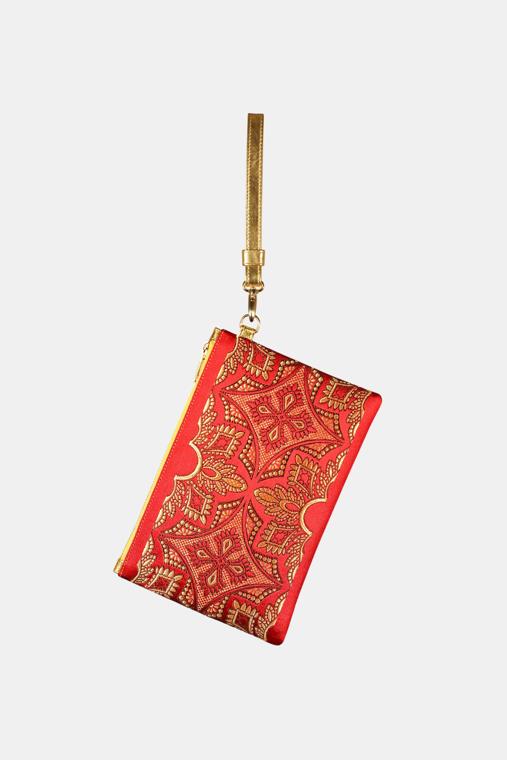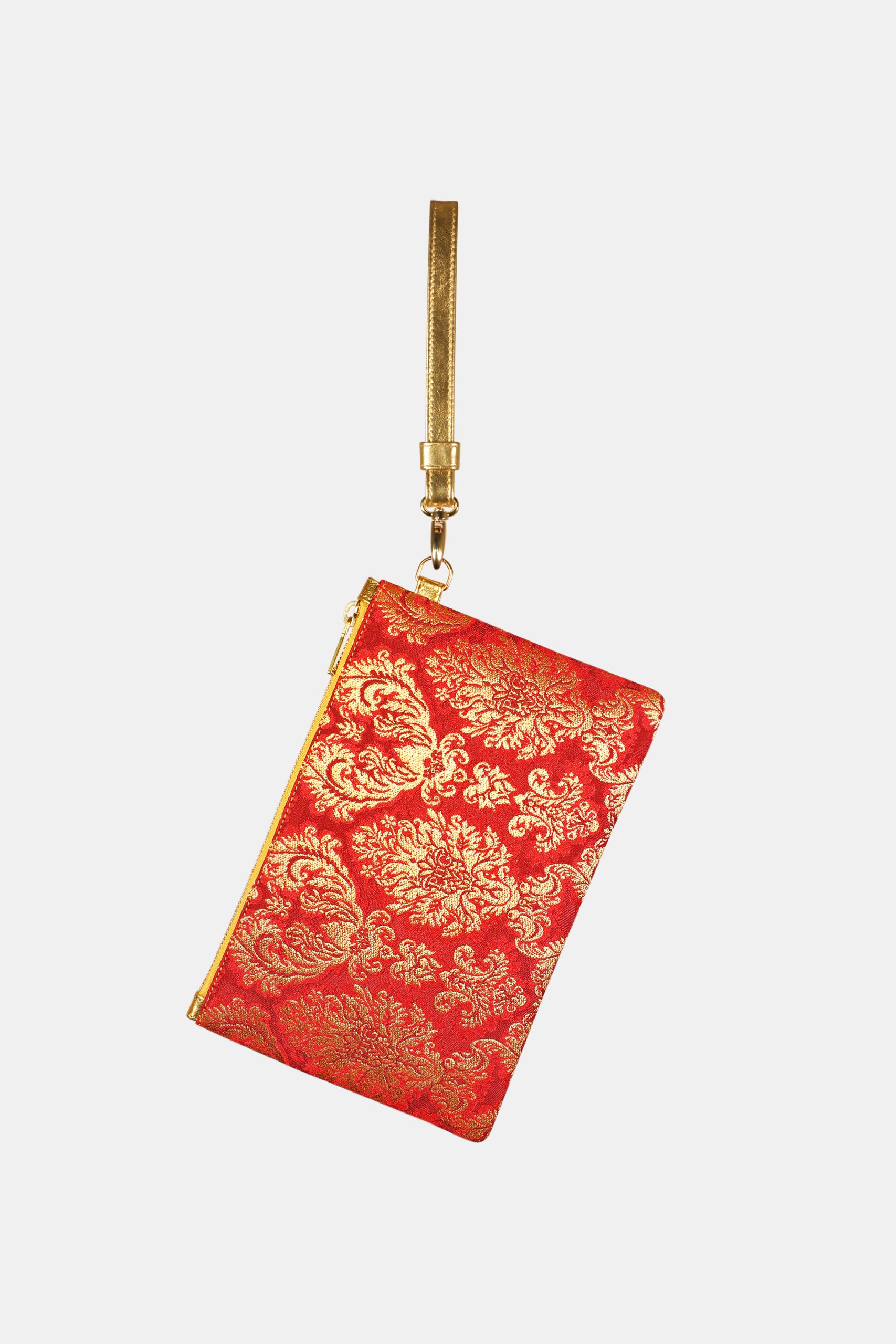Realizzata in broccato PitG filo oro (Disegno Small) nelle tonalità rosso e oro, questa clutch brilla per la sua texture ricercata e per il perfetto equilibrio tra tradizione e lusso contemporaneo. La combinazione cromatica intensa esalta la ricchezza del tessuto, rendendola un dettaglio prezioso per ogni outfit.