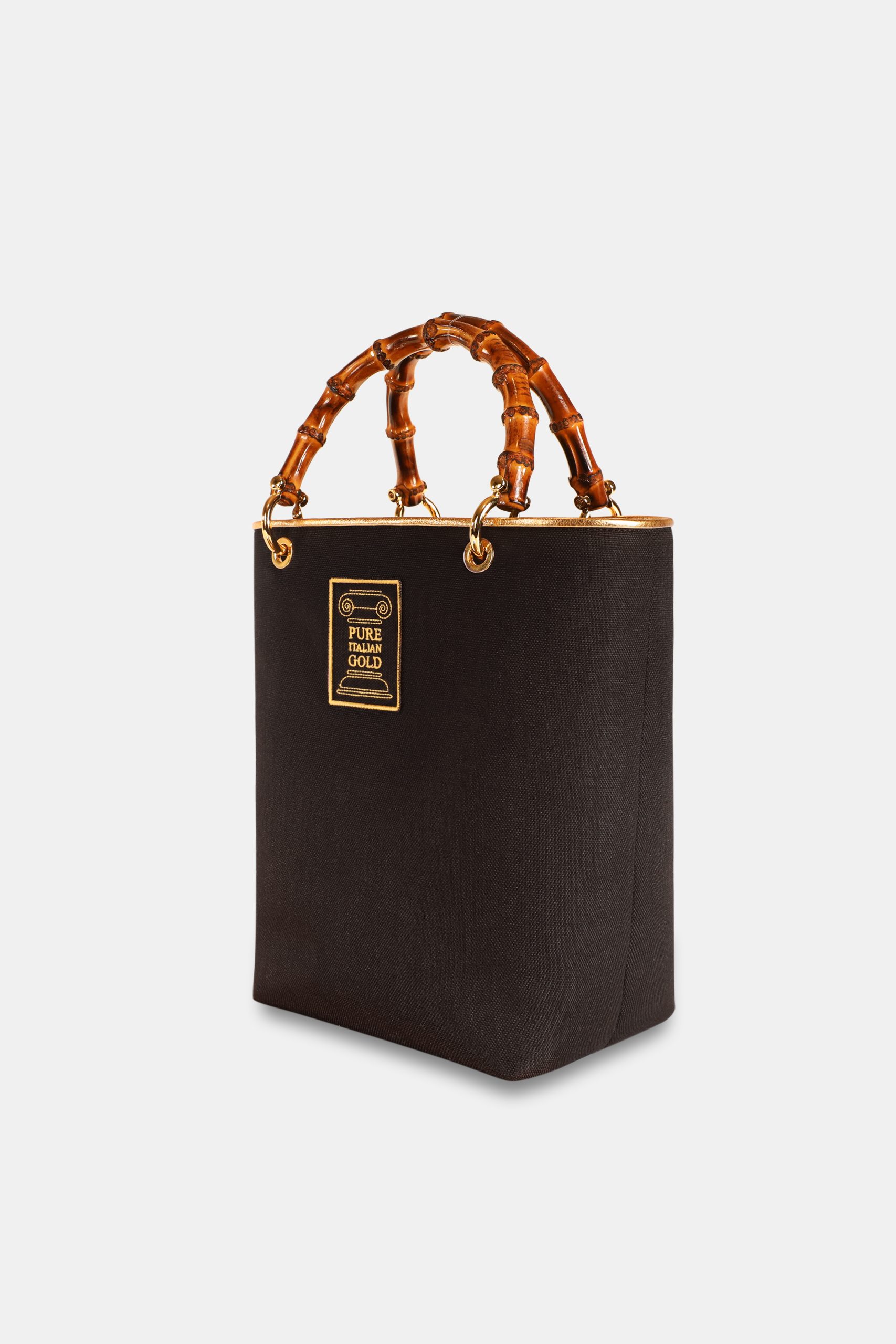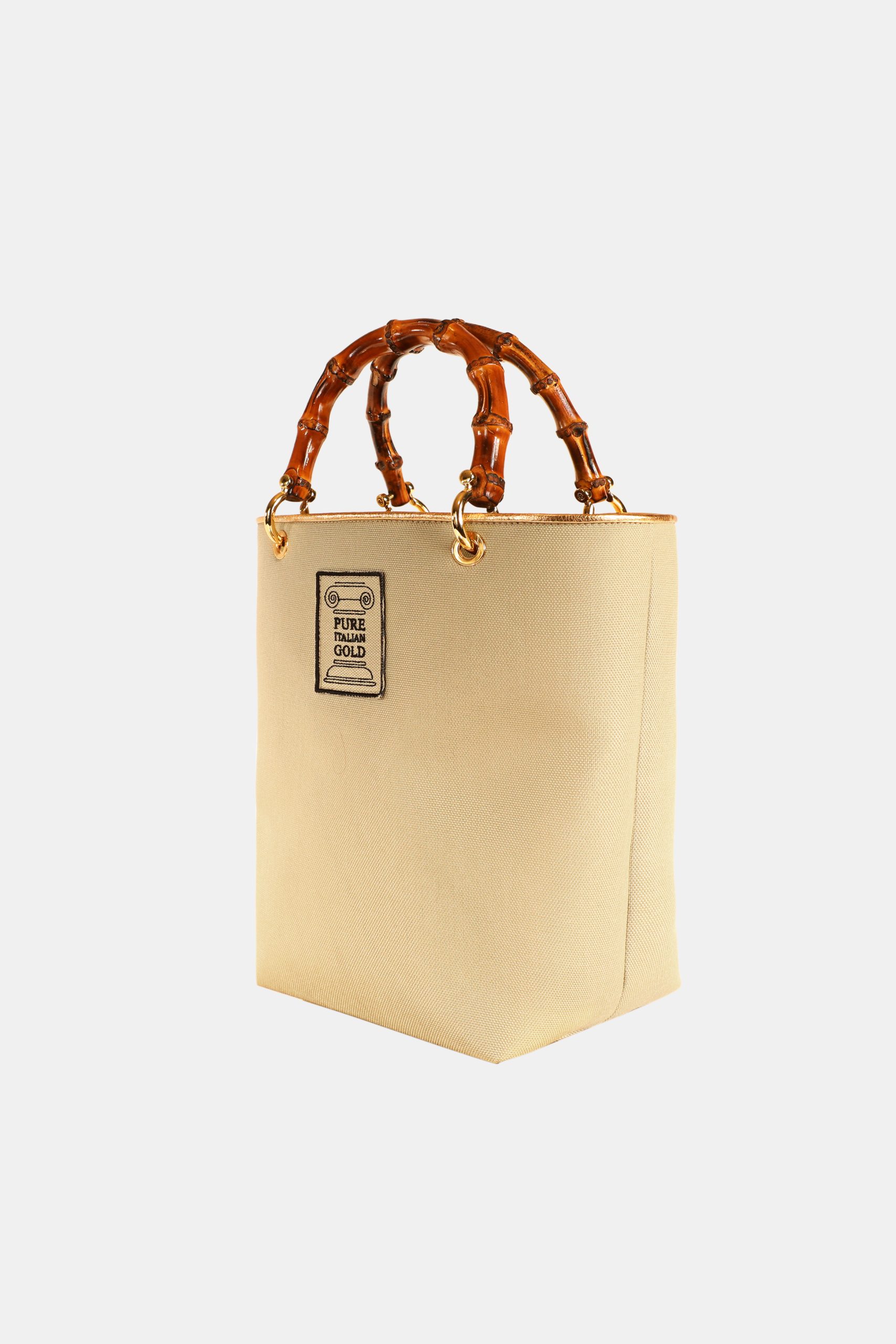 Uno degli elementi distintivi della borsa sono i manici ad arco in bamboo, che conferiscono un tocco naturale e sofisticato, creando un’armonia perfetta tra modernità e tradizione. Gli accessori metallici in ottone, impreziositi dalla doratura a spessore, garantiscono brillantezza e resistenza nel tempo.